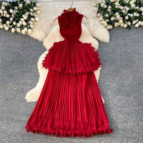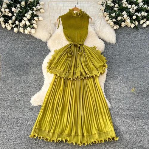Women’s Summer Ankle-Length Dress Pleated Ruffle Neck Solid Color Plus Size Natural Waistline Eco-Friendly for Formal Occasions