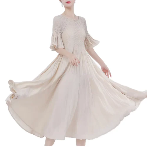 Women’s Short Sleeve High Waisted Pleated Dress Summer Breathable Solid Color Miyake Dress Woven Weaving Method