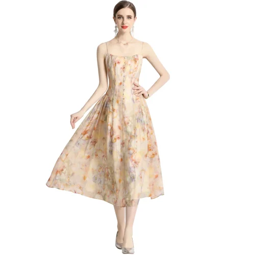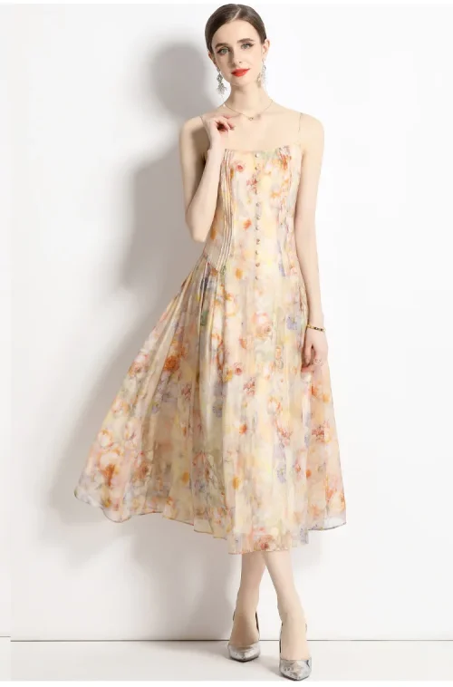 Women’s Waist up Floral Chiffon Suspender Dress Vacation French Gentle Temperament Long Dress