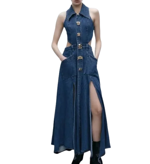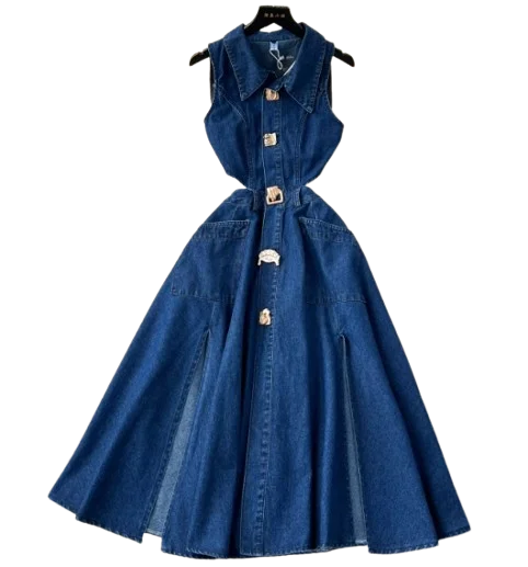 Women’s Wear Turn-down Collar Sleeveless Slit Denim Casual Dresses High Slits Long Dress Elegant Simple Skirt Summer