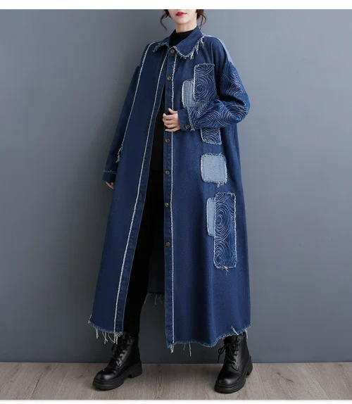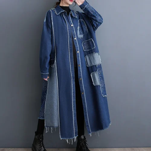X5020 Plus Size 2025 Autumn Winter Loose Retro Double Side Denim Patchwork Dress Coat Women’s Dress