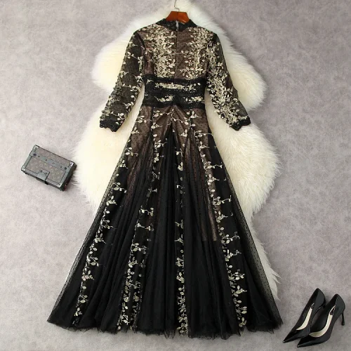 XXL Long Evening Dress 2024 Autumn Winter Party Women Allover Exquisite Embroidery Lace Patchwork Long Sleeve Black Maxi Dress