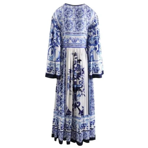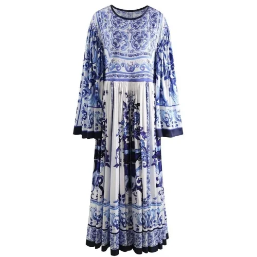 XXL Long Dress 2023 Autumn Style Women O-Neck Vintage Porcelain Prints Flare Sleeve Casual Bohemian Beach Long Maxi Dress Blue