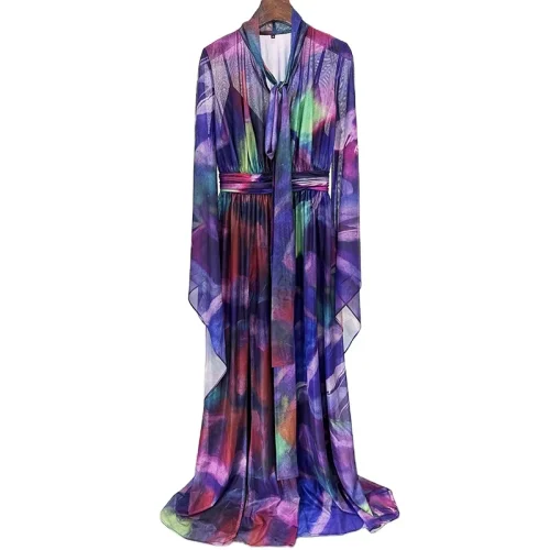 XXL 2025 Elegant Women’s Long Chiffon Flowers Printed Dress High Street Party Style for Holiday Vacation Beach Abaya