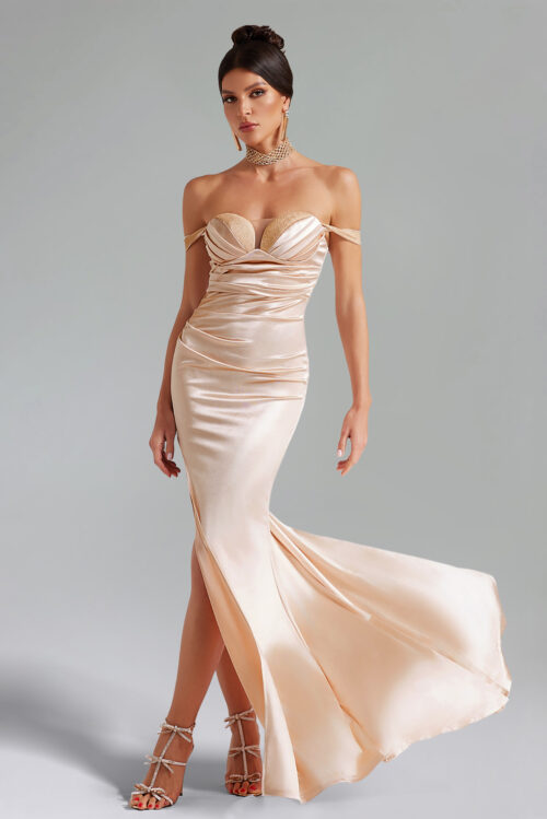 Magdalena Off Shoulder Pleated Slit Maxi Dress – Champagne
