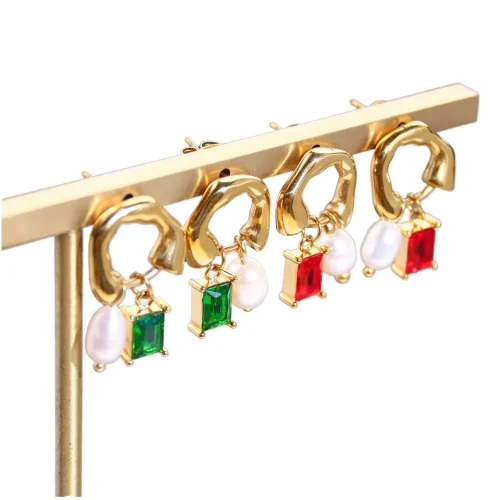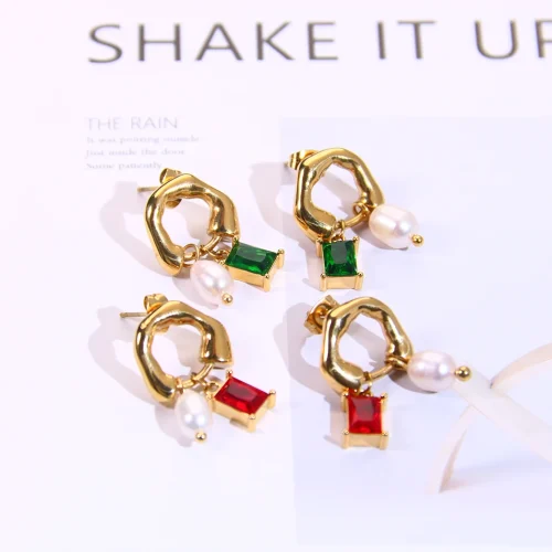 18K Gold Plated Stainless Steel Pearl Jewelry Colorful Cubic Zirconia CC Shaped Earrings for Women