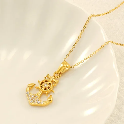18K Gold Plated Stainless Steel Women Anchor Pendant Necklace with Zircon Microset Luxury Party Jewelry