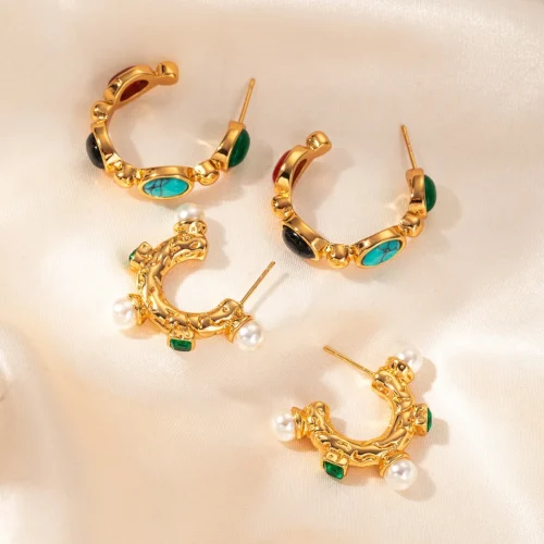 18K Gold Plated Stainless Steel Women C Shape Pearl Ethnic Multicolor Stone Earrings Vintage