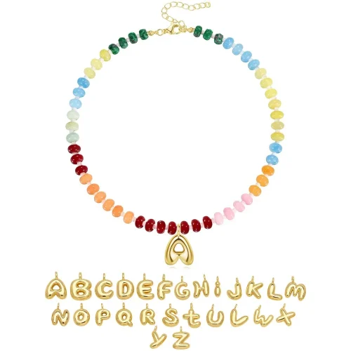 2024 Newest Initial Letter Necklaces Handmade Colorful Beaded Gemstone Choker 14K Gold Bubble Letter Pendant Necklace Jewelry
