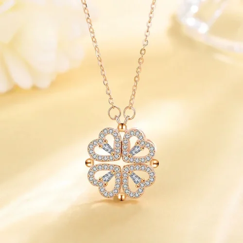 2024 Women’s New S925 Sterling Silver Full Diamond Four-Leaf Clover Folding Heart Necklace