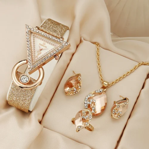 2024 Women Watches Creative Luxury Triangle Rhinestone Dial Frosted Strap Ladies WristWatch Necklace Earrings Rings Jewelry Set