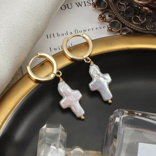 Stylish and Simple Baroque Cross Freshwater Pearl Earrings Copper with Real Gold Plating