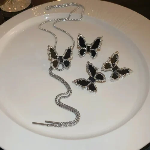 Women Party Jewelry Sets Chain Tassel Necklace Rhinestone Earrings Ring Black Butterfly Necklace Set Jewelry