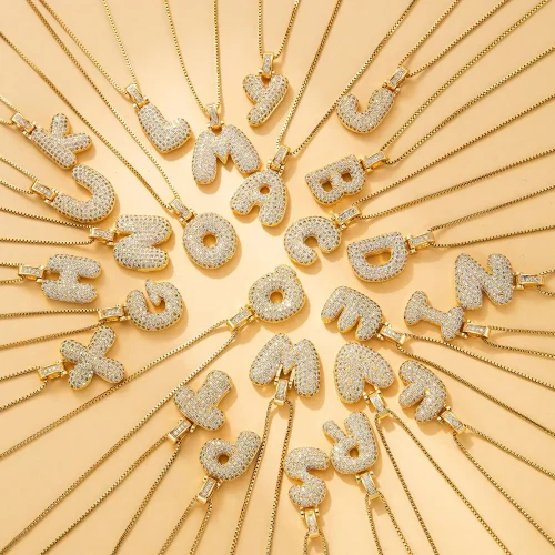 Women’s Bubble Letter Necklace Gold Plated Stainless Steel Zircon Chunky Initial Name Balloon Alphabet Pendant Necklace