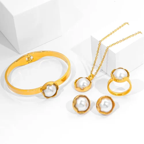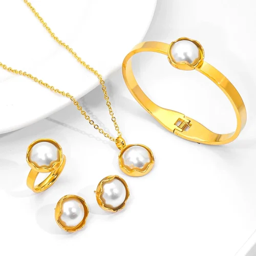 Women’s Classic Style 18K Gold Plated Stainless Steel Jewelry Set Including Necklace Earrings Ring Bracelet with Plastic Pearls