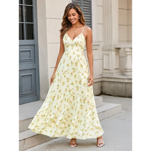 Women’s Casual Summer Floral Maxi Sundress V-Neck Spaghetti Strap Bow Tie Backless Year-Long Beach Flowy Worsted Natural Digital