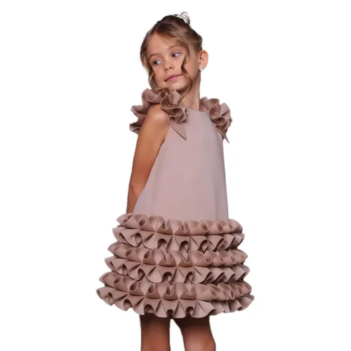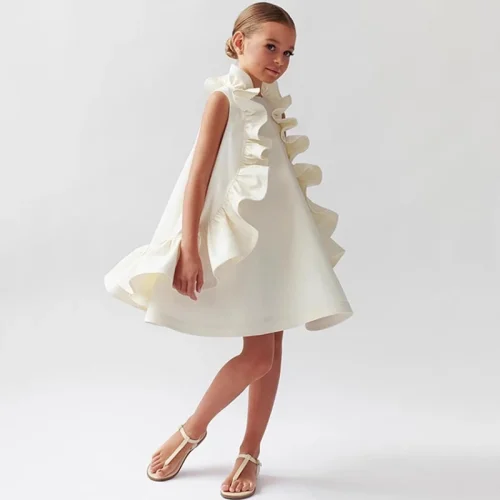 Yalindars pink Solid Color Cotton Puff Circular Pleated Collar Ruffled Edge Baby Dresses Vintage Lace Detail Dress