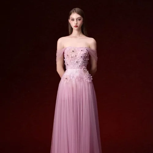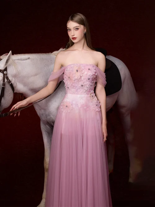 2025 Luxury Floral 3D Mesh Pleated Dresses Women Maxi Evening Dress High Quality Pink Strapless Long Sexy Party Dress