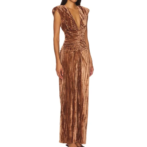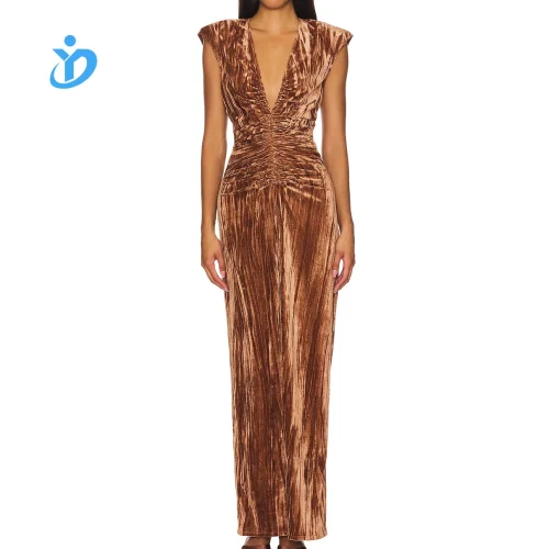 2025 New Fashion Lady Elegant Women Clothing Brown Sexy Plunge Crushed Velvet Sleeveless Ruched Formal Evening Maxi Dress
