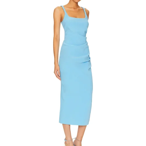 2025 New Women Clothing Blue Crepe Vintage Lady Elegant Sexy Square Neck Ruched Side Casual Office Lady Sleeveless Midi Dress
