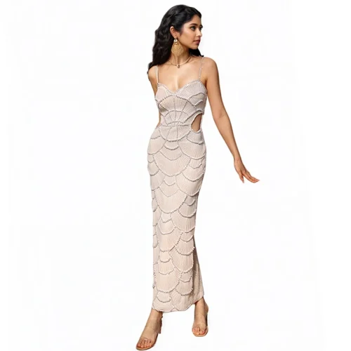 2025 Summer Long Dress Heavy Nail Beaded Halter Dress Small Sexy Hollow Waist Party Dress