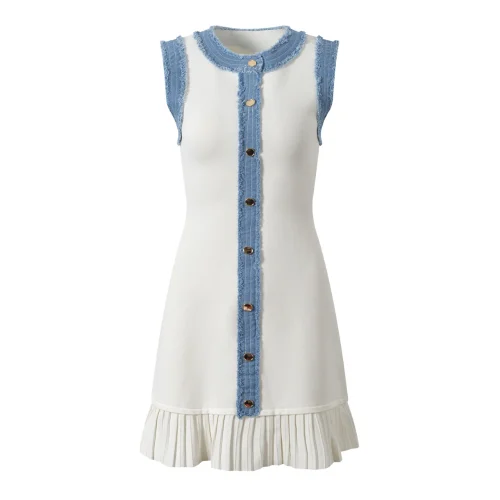 2025 Spring Summer Designed Lady Sleeveless Denim Patchwork Wear Women Single-breasted Short Mini Knitted Slim Fitted Dress