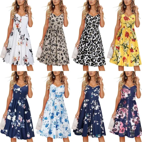 5875-SOPHIA-Casual Beach Sundress Floral V Neck Button Front Floral Dress With Pockets