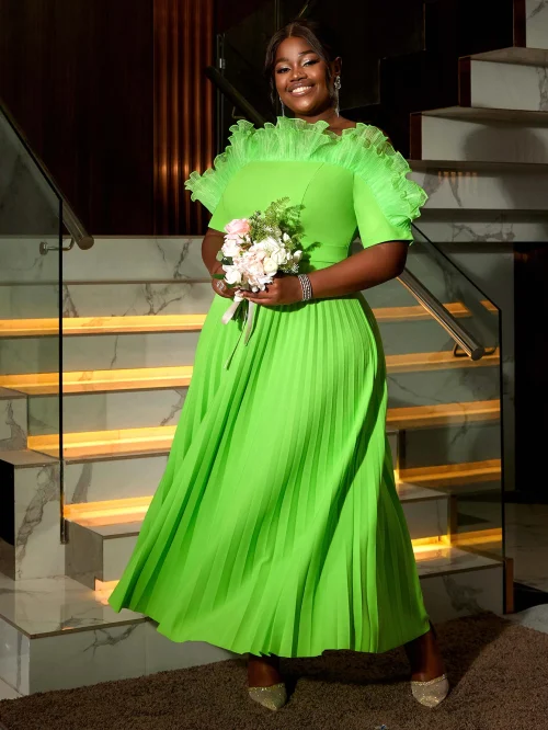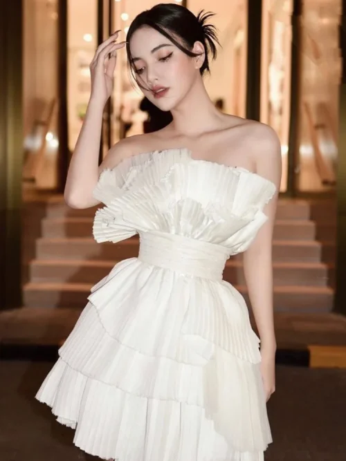 A Line Three-dimensional Pleated Fan-shaped Mesh Puff Evening Party Dress with Ruffle