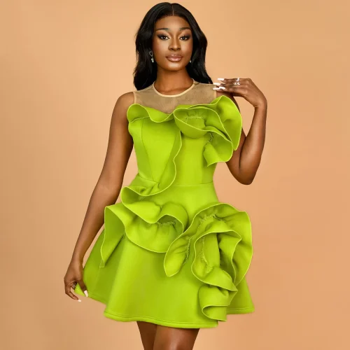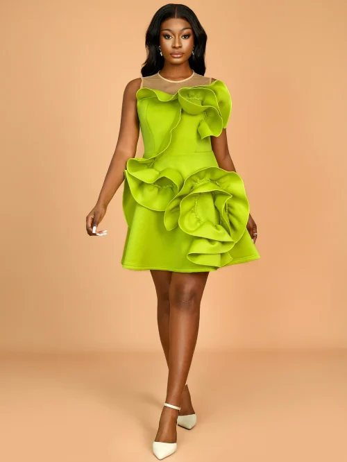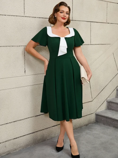 AOMEI Square Collar Tie Ruffle Short Sleeve a Line Summer Sundress Going Out Casual Green Dresses