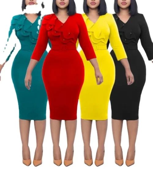African Women’s Office Work Dress Elegant Flounce Beaded with Belt Wrap Hip Dress Seven Sleeves