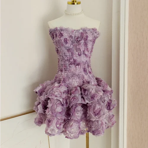 AELESEEN Summer Sundress Sexy Embroidery Floral Short Cake Dress Women Beach Halter Backless Stretch Flower Ruffles Layer Party