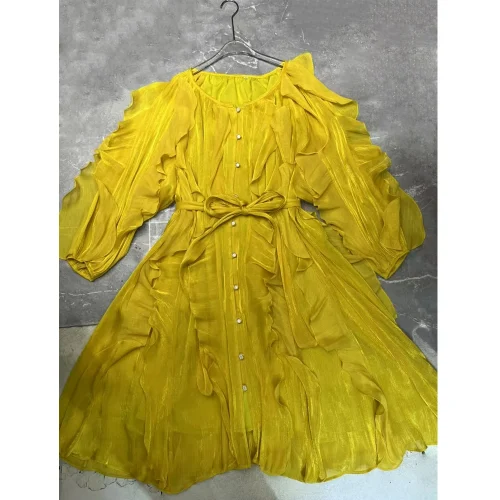 AELESEEN Spring Summer New Elegant O-Neck Lantern Sleeve Tie Rope Mini Sun Dress Women’s Solid Color Fold Casual Dresses