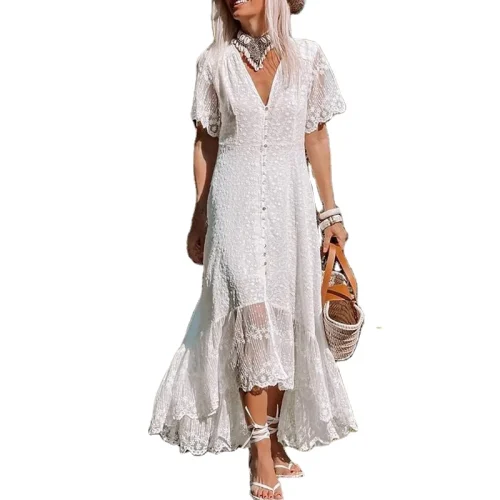Brand ization Asymmetric Straps Women’s Elegant Boho Chic Ruffle V-Neck Maxi Sundress New Fashion Party Casual Lace Dress