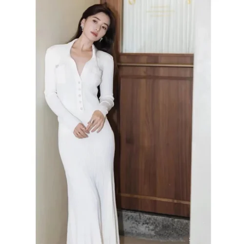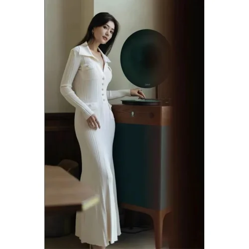 Boutique 2025 Luxury White Elegant Party Evening Dress High Quality Lapel Knit Long Sleeve Casual Dresses