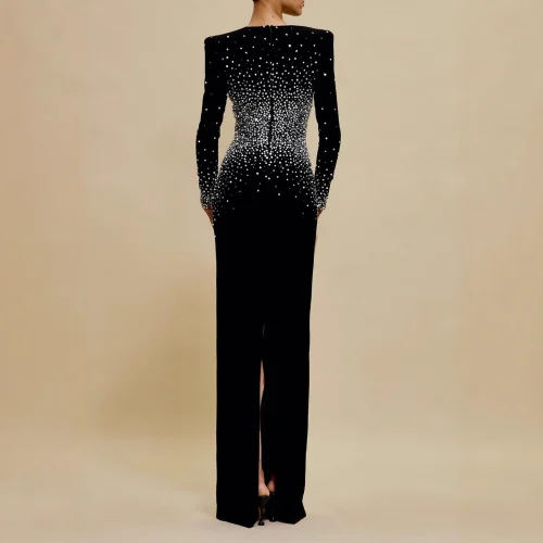 Brand Deep V Neck High-Slit Women’s Sequin Bodycon Prom Dress Evening Banquet Party Gown Pearls Sexy Waisted Split Vestido
