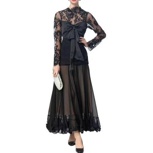 Brand ization High Waist Summer Perspective Club Dress Women Bow Sexy Lace Long Sleeve Maxi Dress