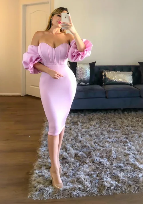 Casual Party Dress for Women Strapless V Neck Pleated Lantern Sleeves Solid Natural Plain Dyed Sustainable Inspired African
