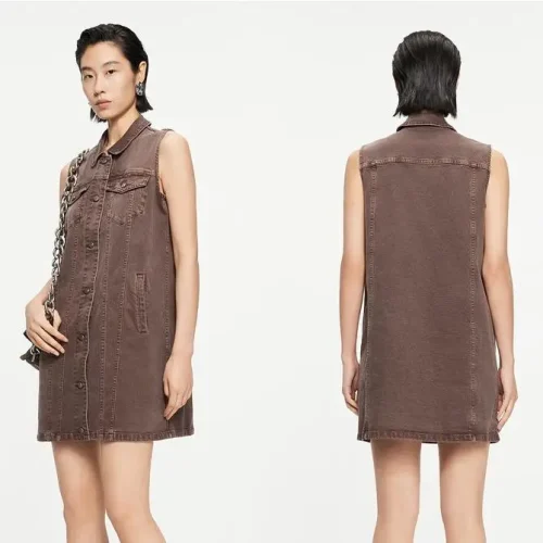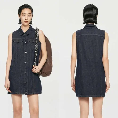 Casual Vintage Spring Button Denim Dress Women Elegant Solid Color Dress Turn Down Collar A-Line Sleeveless Jean Dresses