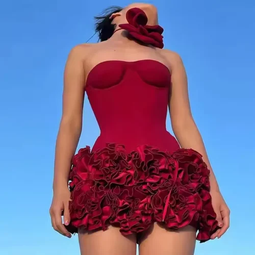 Celebrity Party Cocktail Dress Strapless Backless Red Structured Floral Embellished Mini Length Bodycon Christmas Dress