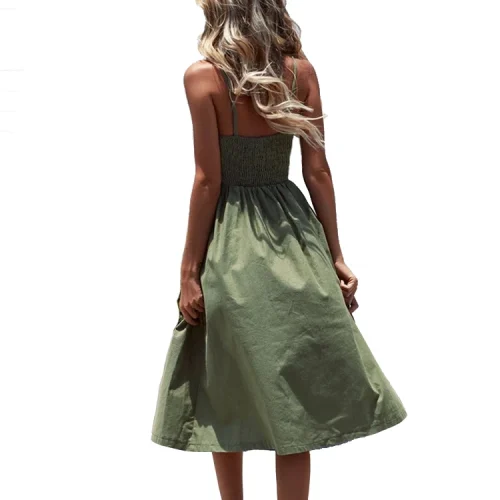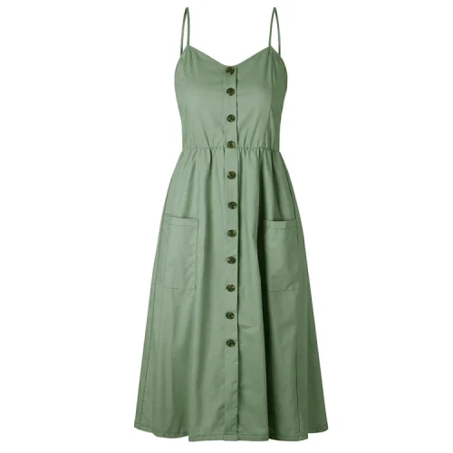 Casual Vintage Sundress Women Summer Dress 2019 Midi Button Backless Beach Dress With Pocket Female