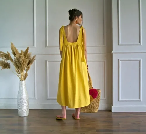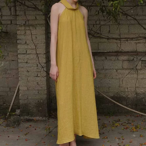 Charming Bright Yellow Open Back Linen Sleeveless Loose Fit Maxi Dress With Wide Strap Cute Open Back Sundress for Cool Ladies