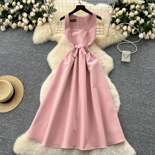 Summer Roman Square Collar Tunic Slim Casual Midi Dress For Women Sleeveless Empire Lace Dress