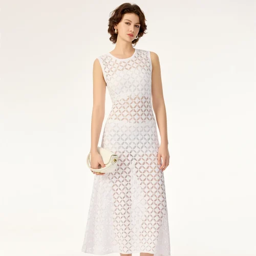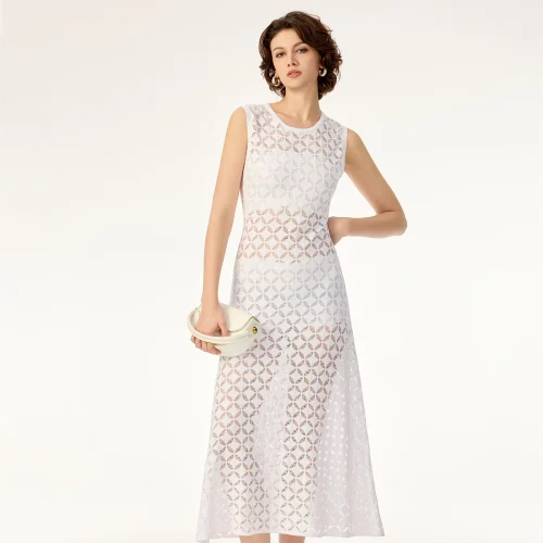Geometric Hollow Pattern Sleeveless Contour Soft Rayon Breathable Drape Summer Cotton Knit Sweater Dress