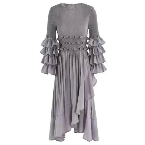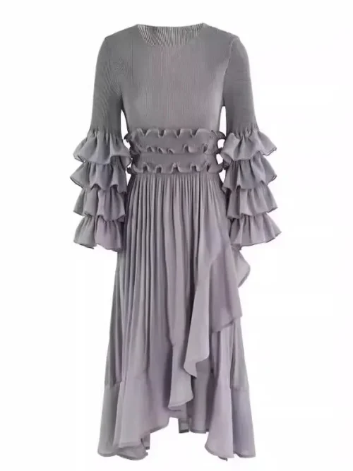 Global Bestseller Miyake Women Casual Pleated Dresses Empire Waist Floral Ruffle Crew Neck Solid Color Elegant Evening Dress