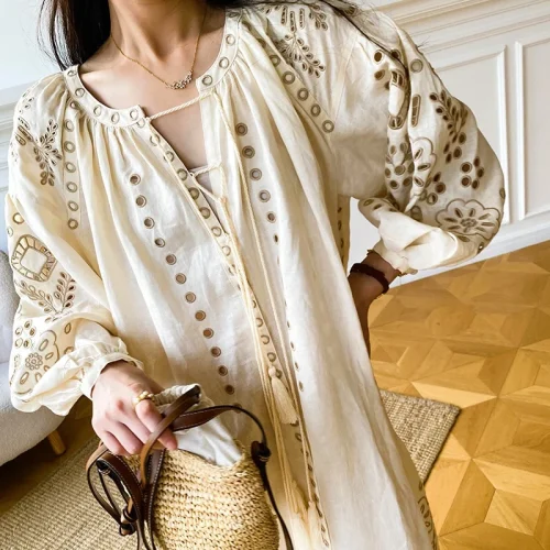 High Quality Crew Neck 3/4 Sleeve Boho Dress Vacation Maxi Loose Dress Summer Luxury Placement Embroidery Dress for Women