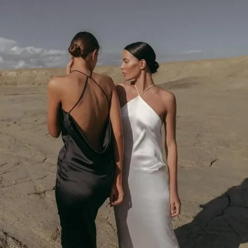 Summer Seaside Vacation Women Ladies Crossover Design Halter Neck Backless Beach Dress Acetic Acid Satin Sexy Dress for Sale