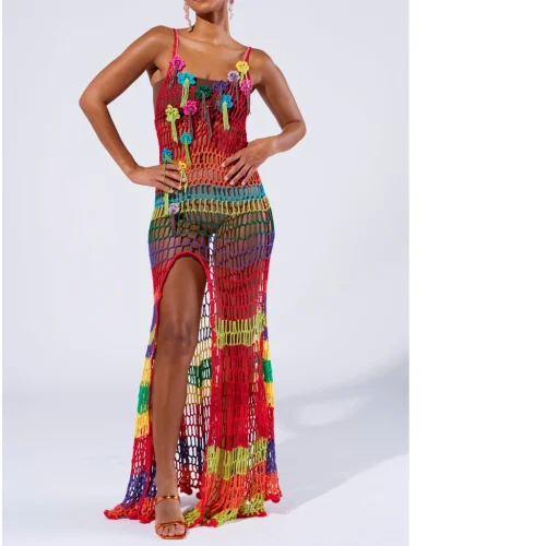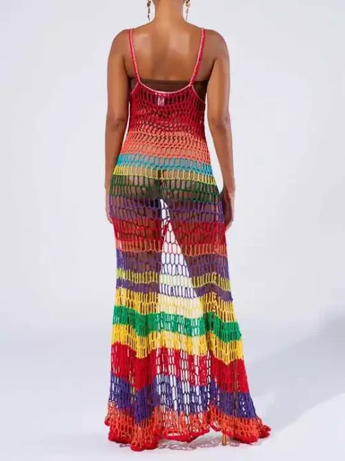 Women Sexy Bodycon Crochet Maxi Dress Summer Rainbow Stripe Handmade Crochet Beachwear Cover up for Vacation