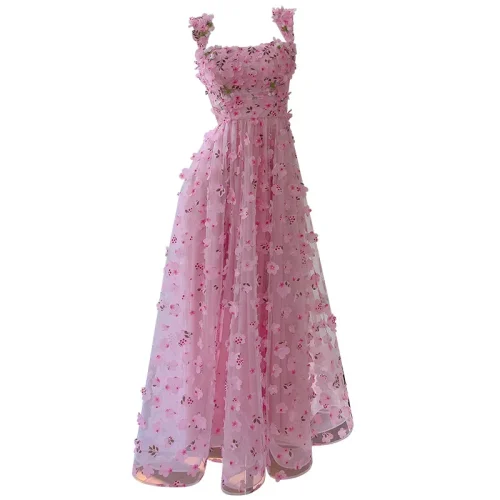 Women to Wear on Dates Summer Vacation Flower Suspender Long Skirt With Waist Lace up and Slimming A-Line Dress