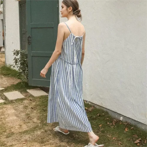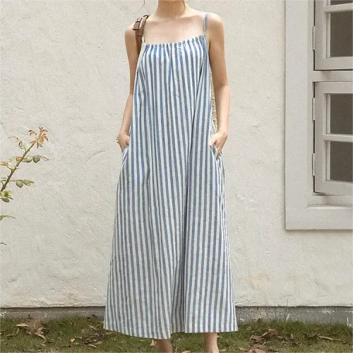 Women Striped Spaghetti Slip Sleeveless Dresses Ladies Casual Maxi Long Light Blue Halter Collar Cotton Linen Dress With Pockets
