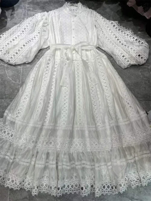 Vintage Casual Midi Dress Women Spring Autumn Design Fashion Half Lantern Sleeve Stand Collar Hollow Patchwork Vacation